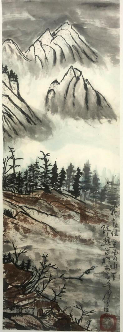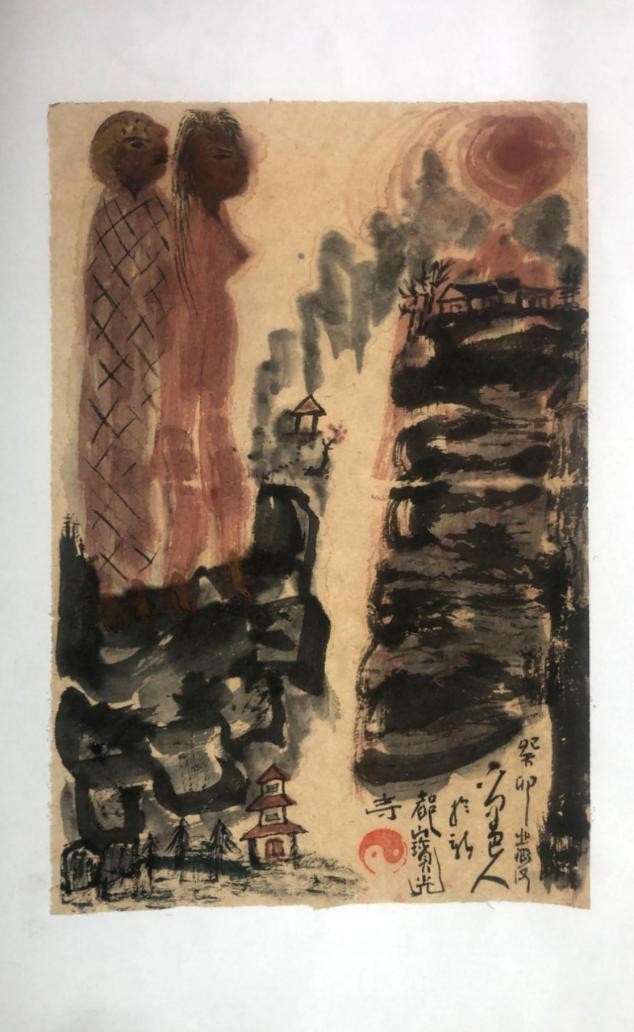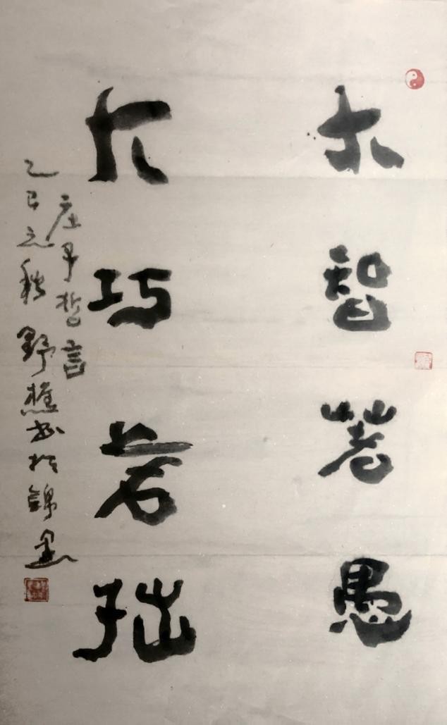 "拙"作为程涌艺术的另一维度,绝非技艺生疏的掩饰,而是历经繁华后返璞归真的美学选择。其书法作品《下里巴人歌》中,看似笨拙的线条实则蕴含深厚的碑学功底,每一笔划都如老农锄地,力透纸背而不事修饰。这种"拙"与傅山"宁拙毋巧"的美学主张遥相呼应,在刻意规避流畅甜媚的当代书风中显得尤为珍贵。程涌的"拙"更体现为对完美主义的抵抗——画面中的"败笔"被有意保留,墨渍的晕染成为构图的一部分,这种对偶然性的尊重使作品充满生命质感。在《野樵课徒图》中,歪斜的茅亭、比例失调的人物,恰恰构成了一种天真烂漫的叙事趣味,比那些精确计算的作品更能触动观者心弦。