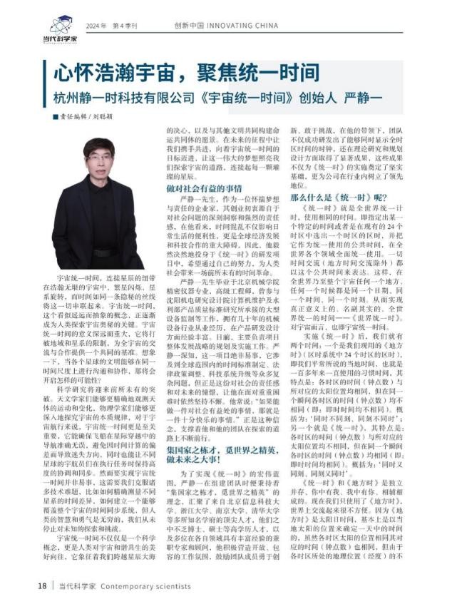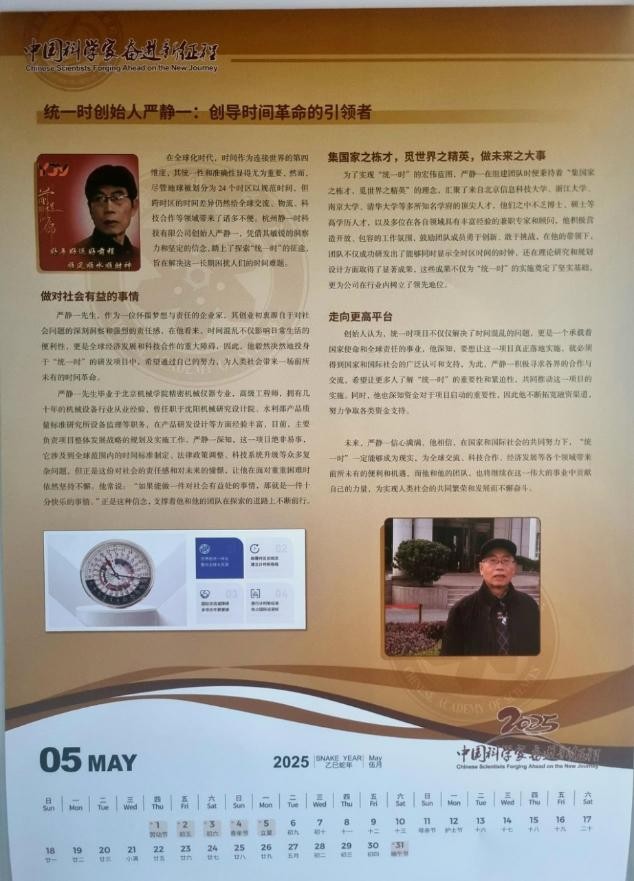 严静一先生毕业于北京机械学院精密机械仪器专业,高级工程师,拥有几十年的机械设备行业从业经验,曾任职于沈阳机械研究设计院、水利部产品质量标准研究所设备监理等职务,在产品研发设计等方面经验丰富,目前,主要负责项目整体发展战略的规划及实施工作。严静一深知,这一项目绝非易事,它涉及到全球范围内的时间标准制定、法律政策调整、科技系统升级等众多复杂问题,但正是这份对社会的责任感和对未来的憧憬,让他在面对重重困难时依然坚持不懈。他常说:“如果能做一件对社会有益处的事情,那就是一件十分快乐的事情。”正是这种信念,支撑着他和他的团队在探索的道路上不断前行。
