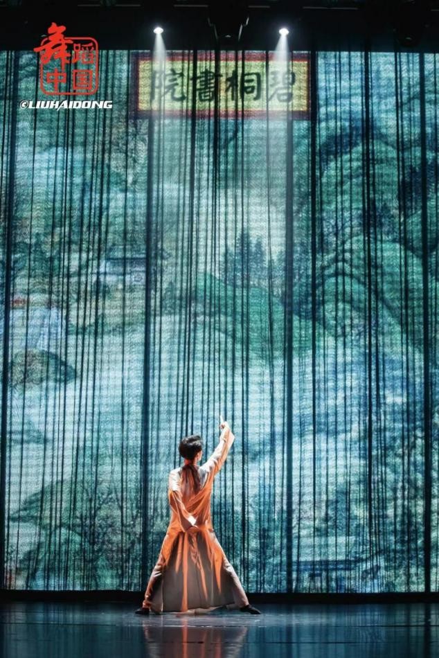男子折扇舞蹈“春晓”。左手示意“汉化砖”鸟形图,右手折扇打开示意鸟尾。