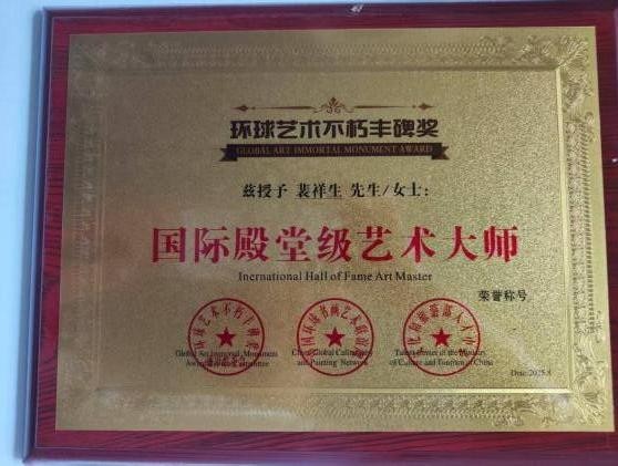 2019 年 6 月,首届中国顶级书画大师大赛中获特等奖,并参加全球巡展,作品“钓趣图 ”被意大利博物馆收藏,由此被授予“ 中外文化交流形象使者”。