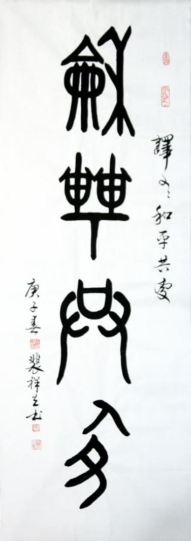 裴祥生,1947 年 11 月生,字墨趣,号翰墨缘,斋名翰墨轩。数十年来,精心研字习画,边临古今碑帖,无论在人物、山水、花鸟、还是在金文、篆、隶、魏碑、楷、行、草等各体书法,在艺术的追求中一贯注重在传统的基础上融诸家精华于一体,严谨不拘,以求美雅共存。不同时期先后得到刘文西、高峡、沙曼翁、徐子鹤、张辛稼等当代大家悉心指导,受益匪浅。现任中国北京国际艺术馆名誉馆长,中国书画家协会副主席,中国美术家协会会员,中国国家特级书法师,中国对外文化交流形象大使。1991 年,作品《观沧海》(曹操 ·篆)参加北京全国书展并获优秀奖。