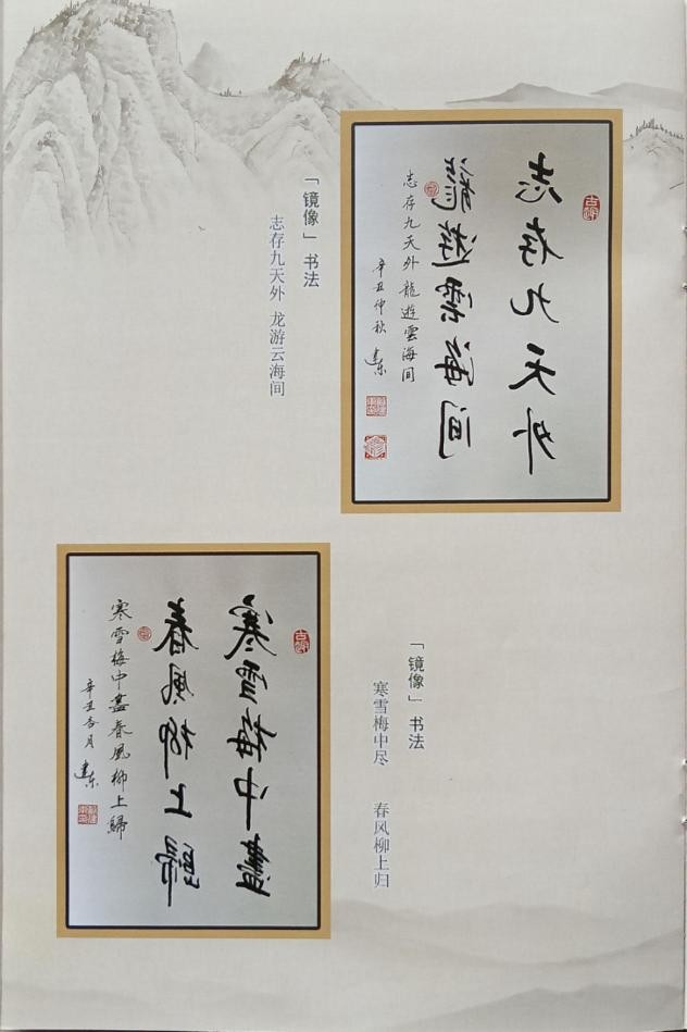 镜像(反书)书法始于南朝,代表作为南朝梁萧景神道阙著名刻石,清代晚期出土于南京,距今1600年。由于因镜像书法难以驾驭,故习书者不多,精道者更是少之。2011年,镜像反正书法作品《福禄寿喜》作为镜像书法代表作搭载神舟八号遨游太空。