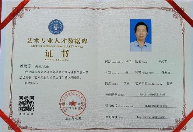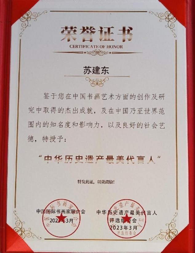苏建东先后获得《中国当代特色书法名家》;2020年《国墨杯》全国书画艺术大赛中荣获“一等奖”;中国公益人物;二十一届中国世纪大采风2021采风人物;2021国际中国公益事业大典《我和我的祖国》特授予《2020年度中国当代特色书法名家》荣誉称号;2021年镜像书法《茶道》在北京中昌鼎源国际拍卖有限公司以17.25万元成交;2021年被写入《世界名人录》《沧海桑田中国巨变》特别推荐人民艺术家;名家推荐-2023书画名家百杰;2022年<美丽中国>授予《中国人民艺术家》荣誉称号;2022年《热血铸军魂,庆祝中国人民解放军建军95周年》被评《著名艺术家》;2023年CCTV央视书画频道签约艺术家;2024年获得《莫奈国际艺术奖》金奖的山水画《苍山恋》在英国罗素国际拍卖有限公司以32万元成交;2024年福禄寿喜摆件在香港国丰拍卖有限公司以人民币28.8万价格成交。同年6月一套书法册页在北京传世水墨拍卖会上以78.5万元成交,2024年9月,两幅镜像书法《宝地生金》和《仁义礼智信》在佳士得国际拍卖公司分别以26万元和22万元的价格成交;同年9月,一幅山水画《苍山恋》荣获《莫奈国际艺术奖》金奖。大部分作品已被国内外各界收藏家,企业家收藏!