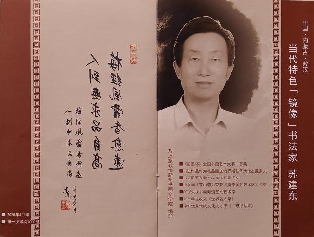 苏建东,艺名“地三鲜”,内蒙古敖汉旗政协新州书画文学院院士、中国当代特色“镜像”书法家,赤峰市书法家协会会员,自幼爱好书法,几十年来笔耕不辍,真、草、隶、及山水国画均有研习,特别是镜像(反书)书法更是精专,其作品被国内外各界广泛收藏。