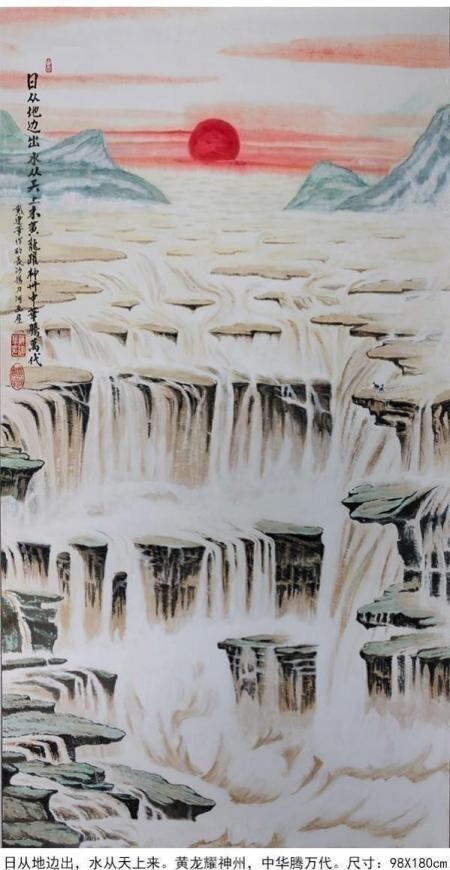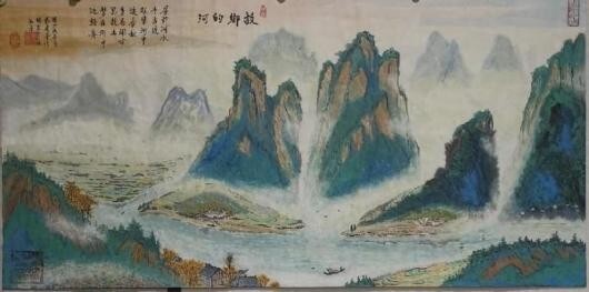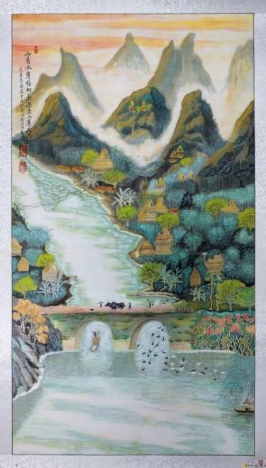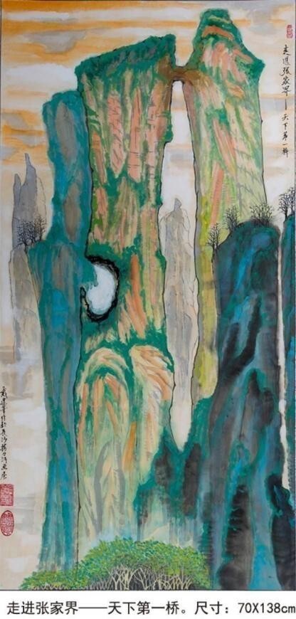 從他用時兩年創作的足以震撼中國畫壇,具有史詩級的百 米山水畫長卷《壯美山河一一走進張家界》中可以看出,其中既有中國畫講究的意境和神韻,又有西畫所追求的重 實和背景,油畫、水彩、寫 意、工筆諸多繪畫技法相互邦 襯,用墨幹、濕、濃、淡把握有度,用筆勺、皴、擦、染、點手法運用自如,。畫作中看似隨意的潑彩潑墨,洽 到好處地營造出山巒溝壑的崢嶸險峻、蒼潤與堅實,不經 意的淡彩談墨拖拽,將畫面視野延伸到不盡的遠方,或濃 或淡的白粉塗抹形成的浮雲霧霾,讓溝谷山巒時隱時現, 變得神密莫測,或重或輕的墨點潑灑與或長或短的線條勾 勒穿扦,讓草地叢林突現,讓川流瀑布飛灑。他的画作被 收入中国国家“艺术大家檔案”。