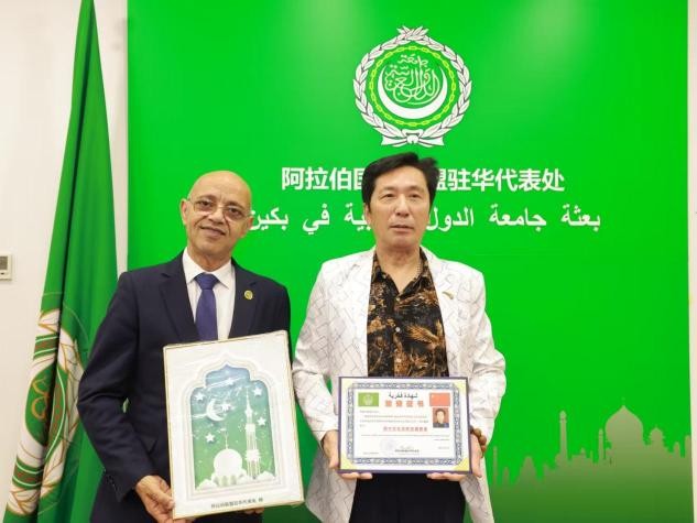阿拉伯国家联盟驻华大使艾哈迈德·哈菲兹为滕建宝颁发阿中文化友好交流使者荣誉证书。