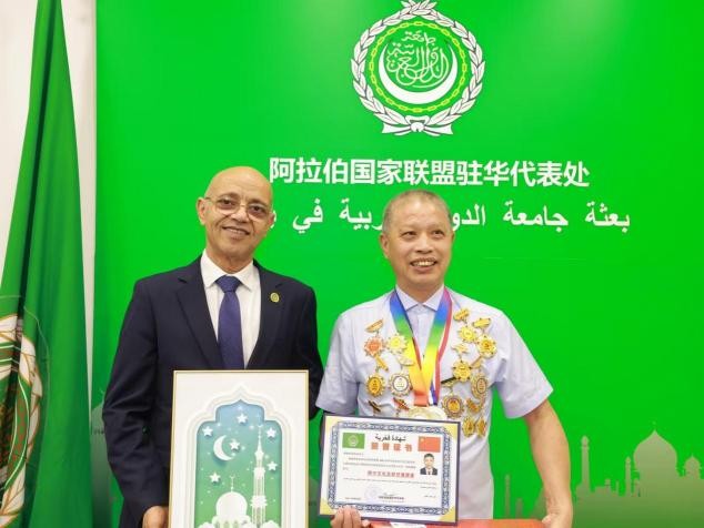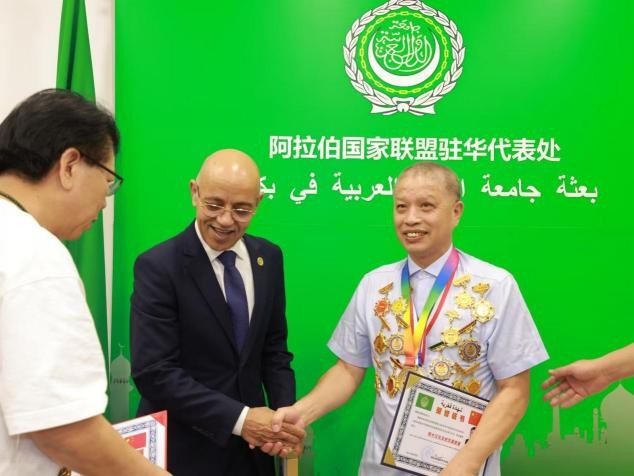 阿拉伯国家联盟驻华大使艾哈迈德·哈菲兹为夏积相颁发阿中文化友好交流使者荣誉证书。