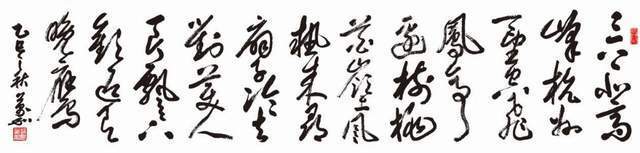 而赵万和的草书,则长枪大戟,摇曳生姿。一是他吸收了章草的成分,获得了额外的古意。二是强调了用笔的留驻。有时积点成线,增加了点画的内涵。三是避开了行间穿插,采用有行无列式布局,使作品气息流畅,自然大气,这也与他的审美追求一致。