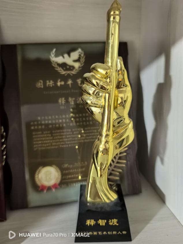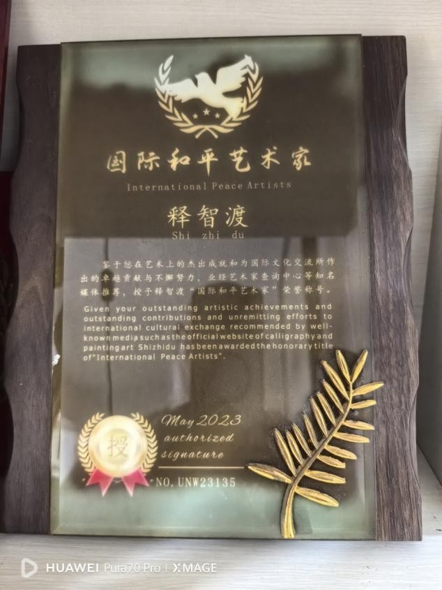 智渡禅师简介禅师,俗家姓张,法名昌身、字智渡、起渡、妙定、衍明……皆传承法师所赐。禅师生于浙江仙居,毕业于武汉水利电力学院(现已并入武汉大学)。出家后常住浙江天台山慈恩寺,是当代肉身菩萨永慈大师禅密净律诸法脉的接续者,2003年5月担任住持至今,也是佛门天台宗46代、禅门沩仰宗第10代法嗣。同时,禅师尚是镜心印社国际书画艺术研究中心主要创办人、兼任慈恩寺佛教艺术研究院代院长,中国玉观音慈善义诊队顾问、武汉大学深圳研究院特聘哲学教授...... 禅师慈悲为怀,倡导护生、复兴文化与临终关怀等公益慈善事业,并兼顾佛像雕刻、寺院规划、建筑设计和工程监理。禅师于上世纪九十年代初即倡导非药物疗法,并实践用分子医学和分子生物学来分析和研究病理,已有相关著作提交出版社审批。在书法和著述方面也有所成:禅师所写的“福”字意象画书法,据说是继康熙“福”字之后既拥有了五字合一又凸显了意像字画的不二的创举;2016年春节至今,已有上万“福”字进入了千家万户。禅师的梵文书写与禅意画也很有特色。出版的书籍和纪录片有《佛门探宝》、《幸福大道》、《当下解惑》、《临终关怀》往生教导片等等;创作的歌词有《白云山的月亮》、《皈依三宝》、《受戒好》、《罗汉舞》、《天台山》、《燃灯古洞》等十多首,其中《天台山》由当时的中国音乐家协会副秘书长田晓耕谱曲,《罗汉舞》由作曲家蓉梓谱曲…… 禅师重视人才培养,传法授徒严格认真,讲究依业、对机。自从2003年接任慈恩寺住持以来,以弘扬止观为己任,其影响已及全国各省市与欧美和东南亚。2022年被评为人民书画家,2023被评为国礼艺术家、国际和平艺术家,2025年世纪大风釆活动大会上被授予农业领城品牌人物